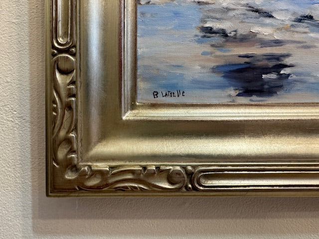 The painting measures 8" x 10" and is framed by the artist, in a classic silver wood frame, with final measurements approximately 14.5" x 12.5".