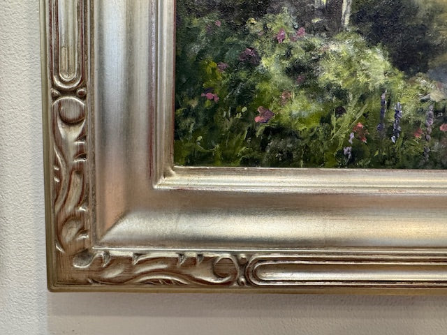 The painting measures 8" x 10" and is framed in a classic silver wood frame, with final measurements 14.5" x 12.5".