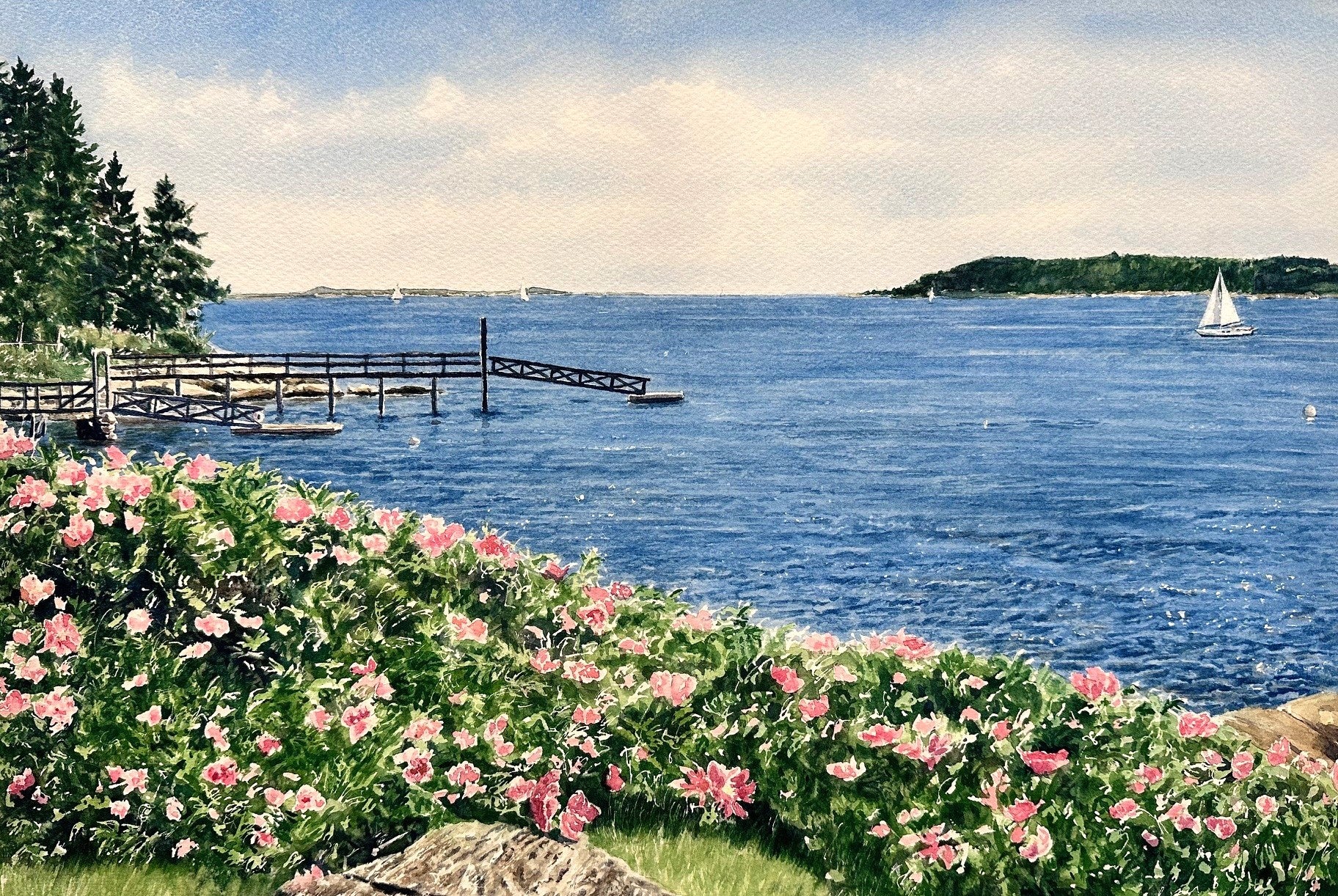 Spruce Point is an original watercolor by Beth Whitney. Beth captures the beauty of the Maine coast in her paintings. She brings the serene essence of Spruce Point to life with delicate brushwork and atmospheric depth.
