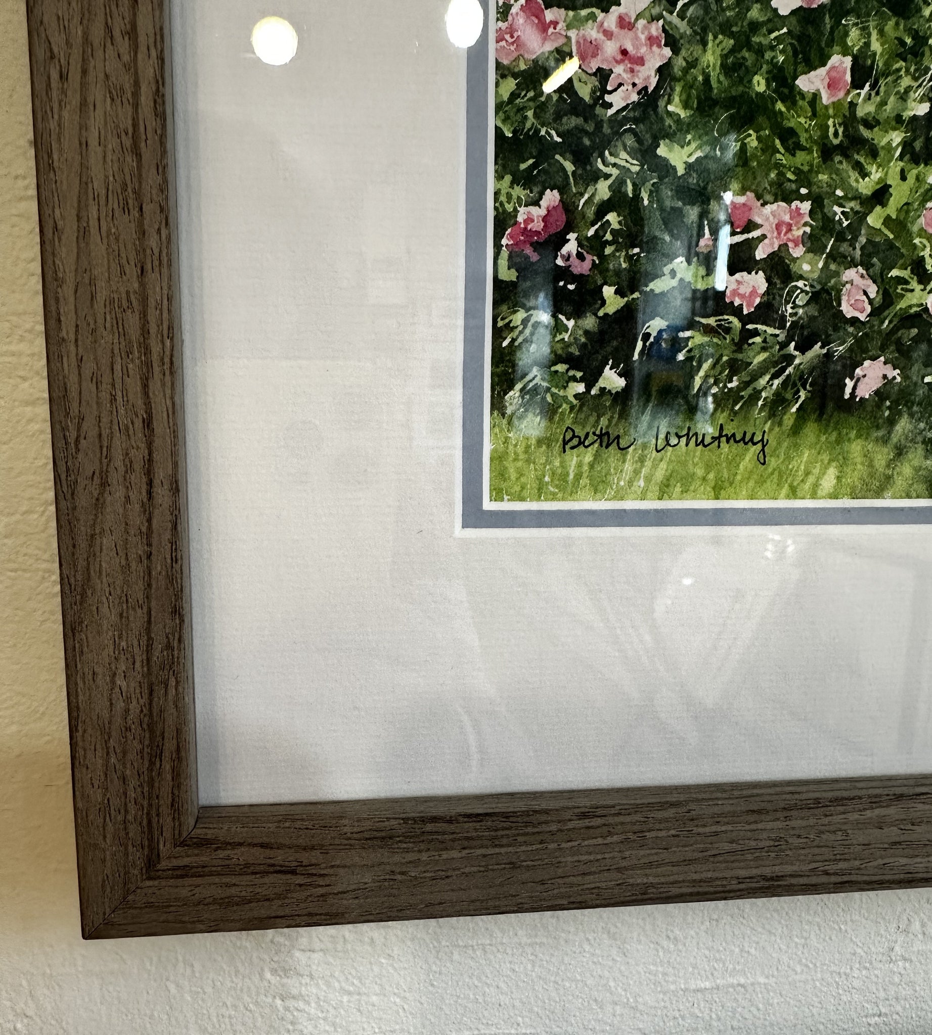 This piece is framed in a natural wood frame with double archival mats. The picture measures approximately 27" x 20" with the frame