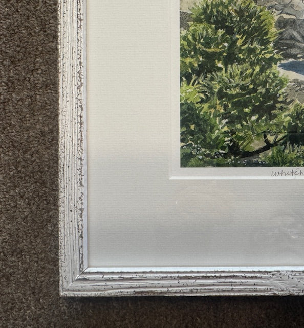 The framed piece is double matted with archival mats and framed in a natural white-washed wooden frame and measures approximately 22" x 17.5".