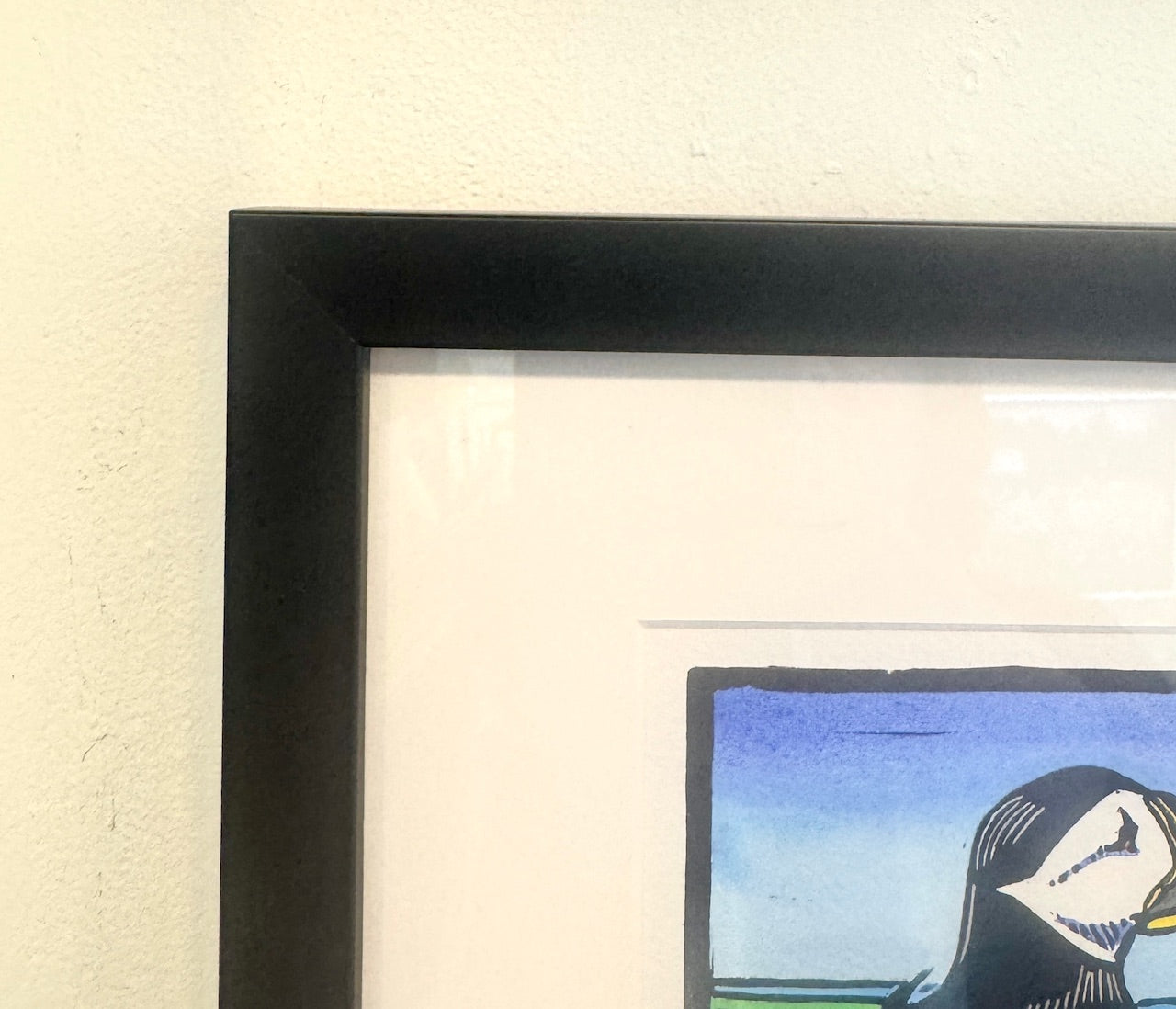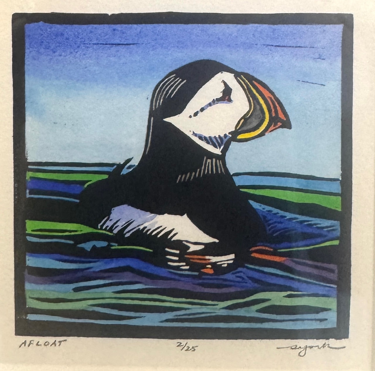 Afloat is a reduction linocut print of a single puffin by Maine artist, Sherrie York.