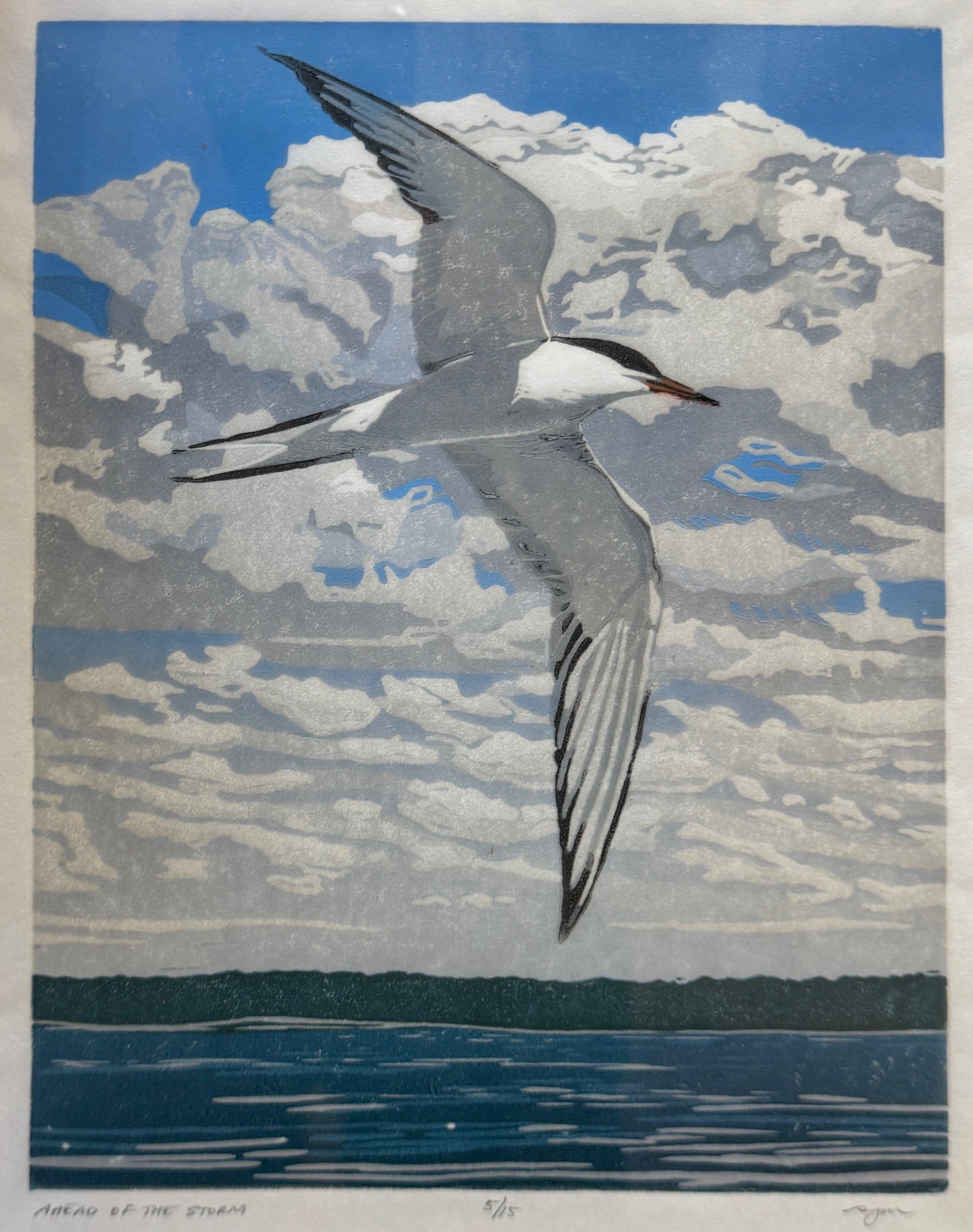 The graceful gull takes center stage in this captivating reduction linocut by Sherrie York. Sherrie keeps her editions super small.
